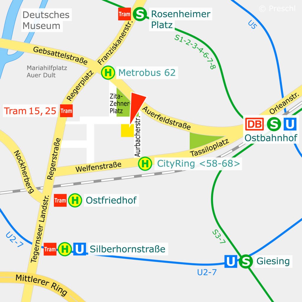 Unser Büro in der Aurbacherstraße 2, 81541 München in der Oberen Au auf dem östlichen Isarhochufer ist gut erreichbar auch mit den öffentlichen Verkehrsmitteln.